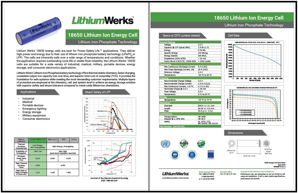 Offering >2,000 cycles at 80% DoD and a pulse discharge rate up to 60A, it ensures both safety and long-term reliability. Certified for global safety and transportation standards, the AER18650m2A2 provides consistent power and safety under extreme environmental and abuse conditions.